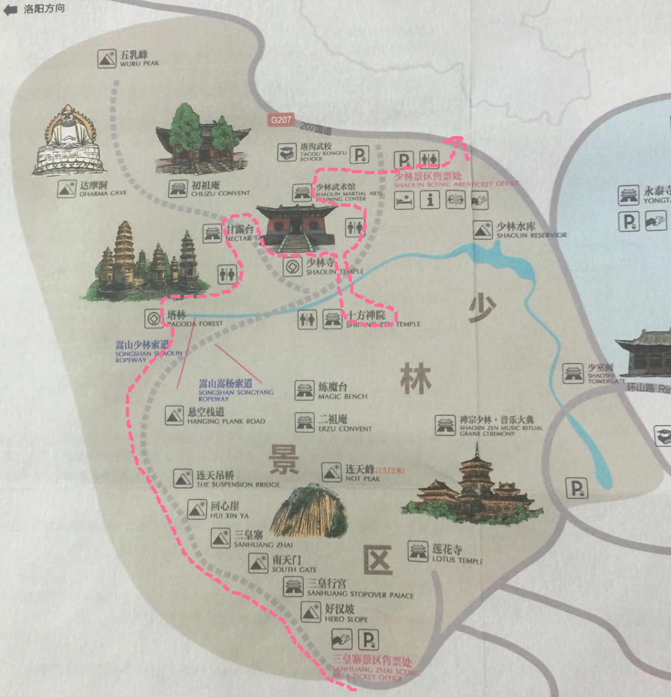 就地圖可以看出來少室山的路線有二,一是從三皇寨景區入,經好漢坡過南天門到三皇寨,再經吊橋到少林索道處下山。二則反之。主要玩法有二: